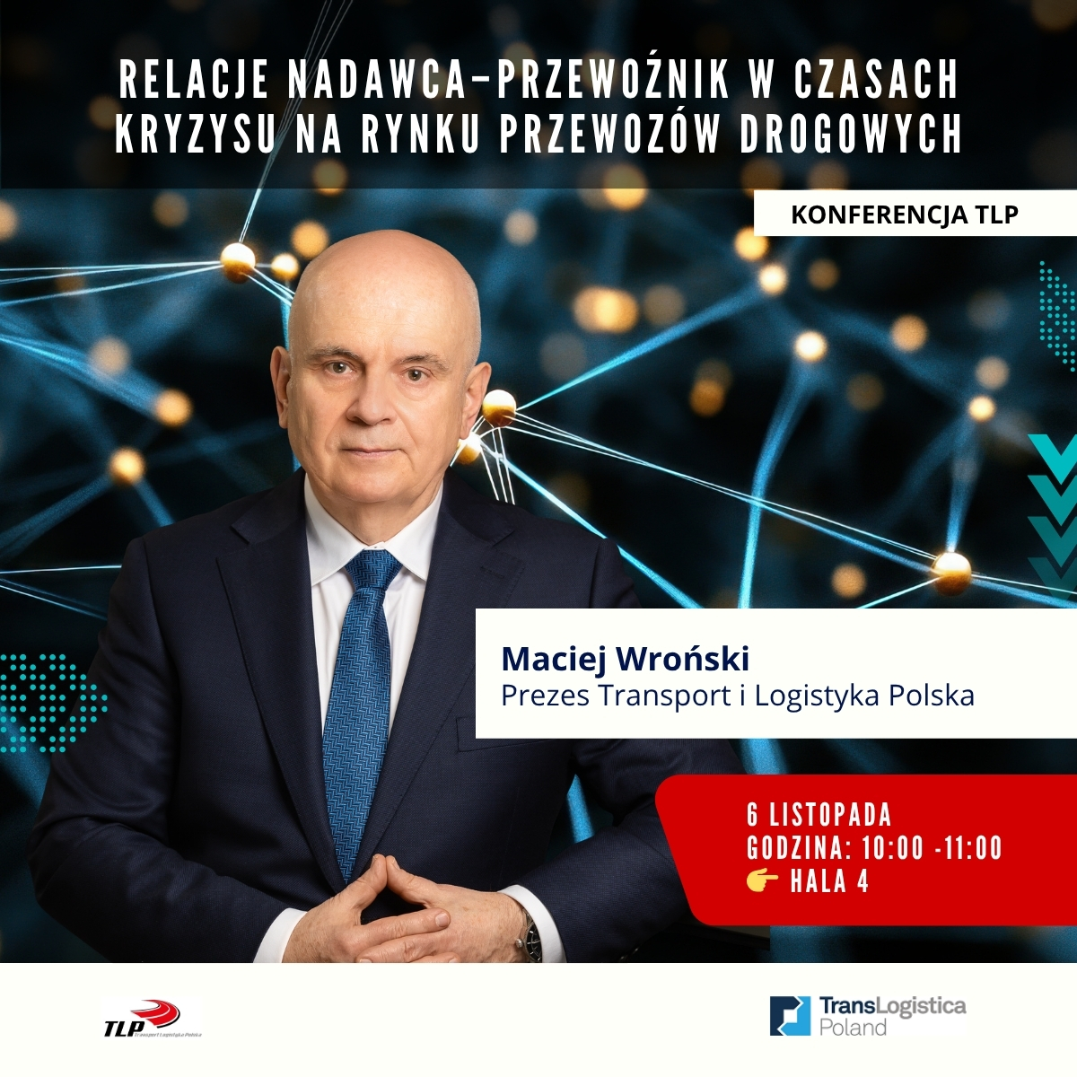 🕐 13:00–14:00 – Maciej Wroński, prezes TLP, weźmie udział w debacie „Transport 2030: innowacje, platformy i kapitał – kto naprawdę będzie rządził polskim TSL?”