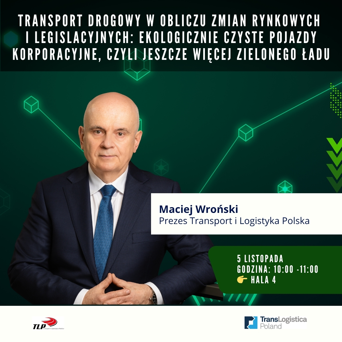 🕙 10:00–11:00 – Maciej Wroński na scenie w wystąpieniu „Transport drogowy w obliczu zmian rynkowych i legislacyjnych: ekologicznie czyste pojazdy korporacyjne, czyli jeszcze więcej Zielonego Ładu”