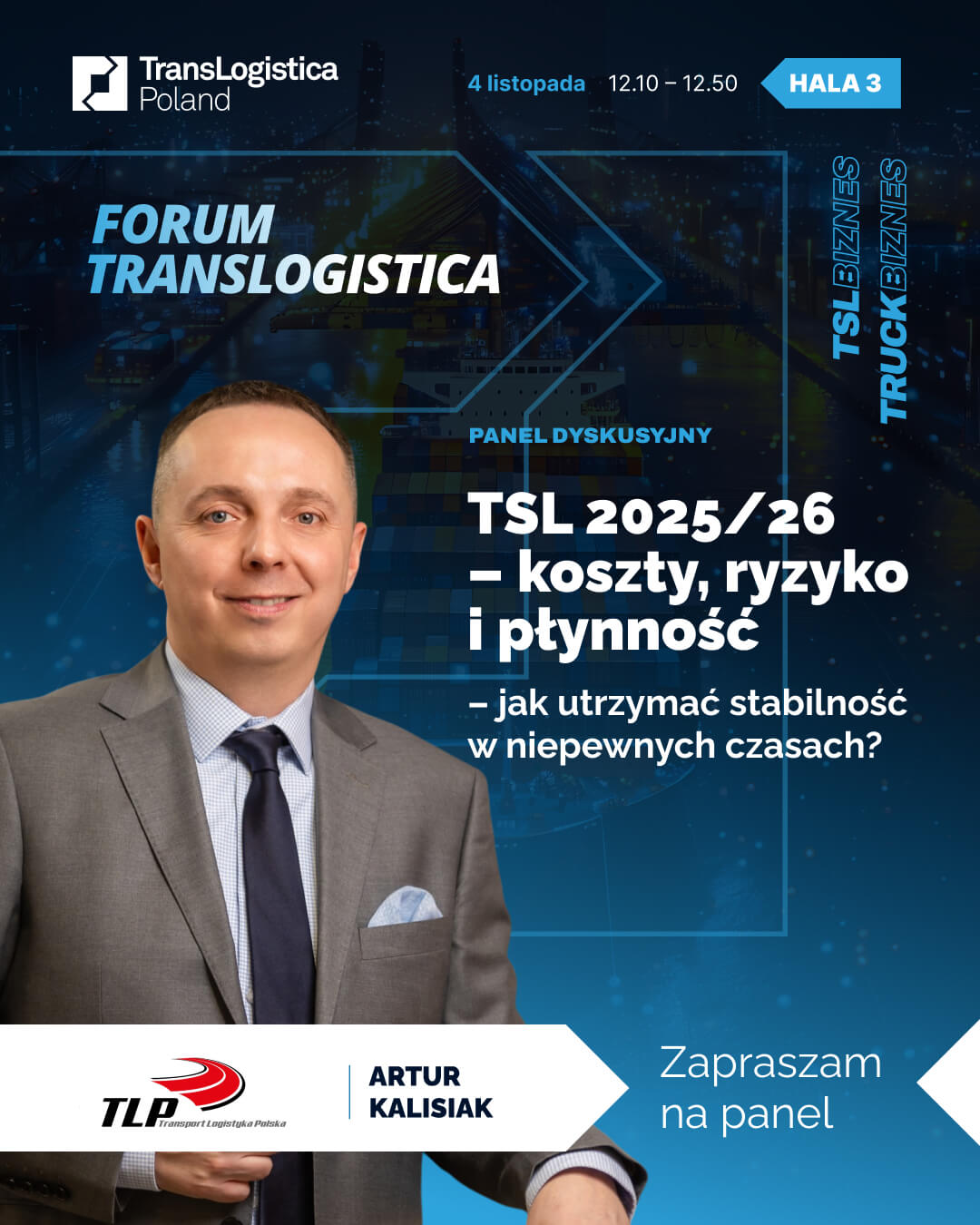 🕛 12:10–12:50 – Artur Kalisiak, dyrektor ds. projektów strategicznych TLP, wystąpi w debacie „TSL 2025/26 – koszty, ryzyko i płynność. Jak utrzymać stabilność w niepewnych czasach?”